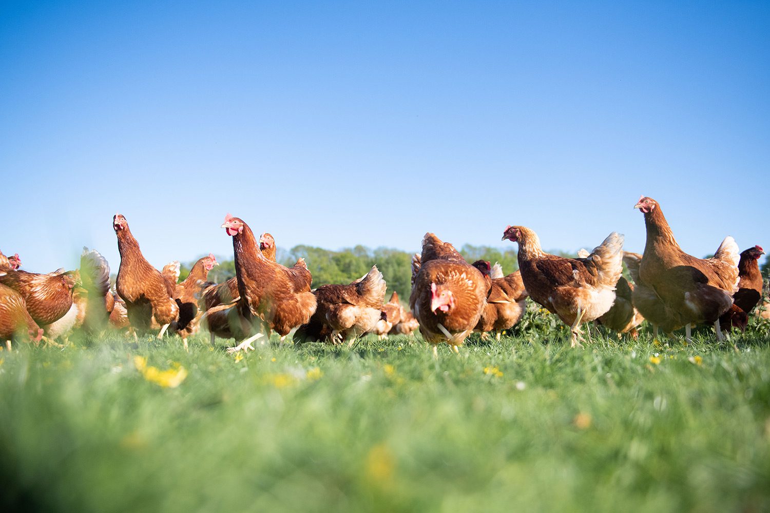 The only way to ensure this despite many hens being labelled free range is to keep the colony sizes small. For example if you have 45,000 hens in one hen house, there is no way that all of the hens will leave the house because its significantly difficult for them, imagine trying to make your way through a crowd of 45,000 people to get out a door, its not very easy!! This does however dramatically reduce the costs of production as the hens eat less food as they aren’t running about outdoors, as a result many hens which are labelled free range despite having access to the outside will rarely if ever go outside. Harry’s hens are in houses capable of holding no more than 600 hens, this means that all the hens can freely leave the house every morning to hunt for worms and eat the grass and clover from their organic paddock.